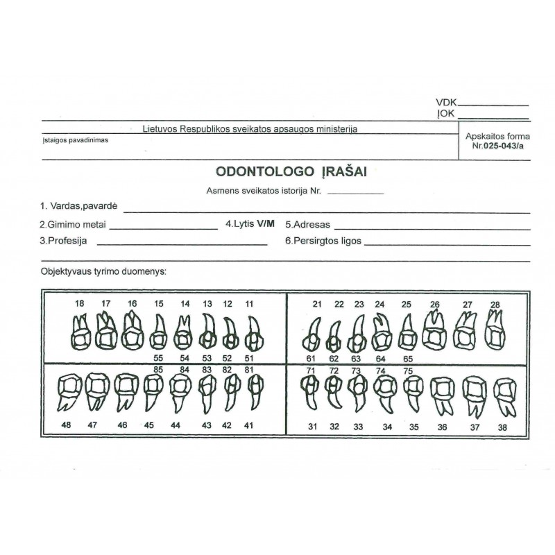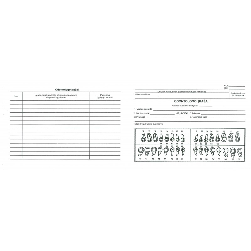 Odontologo įrašų kortelė, forma 025-043/a, 250vnt