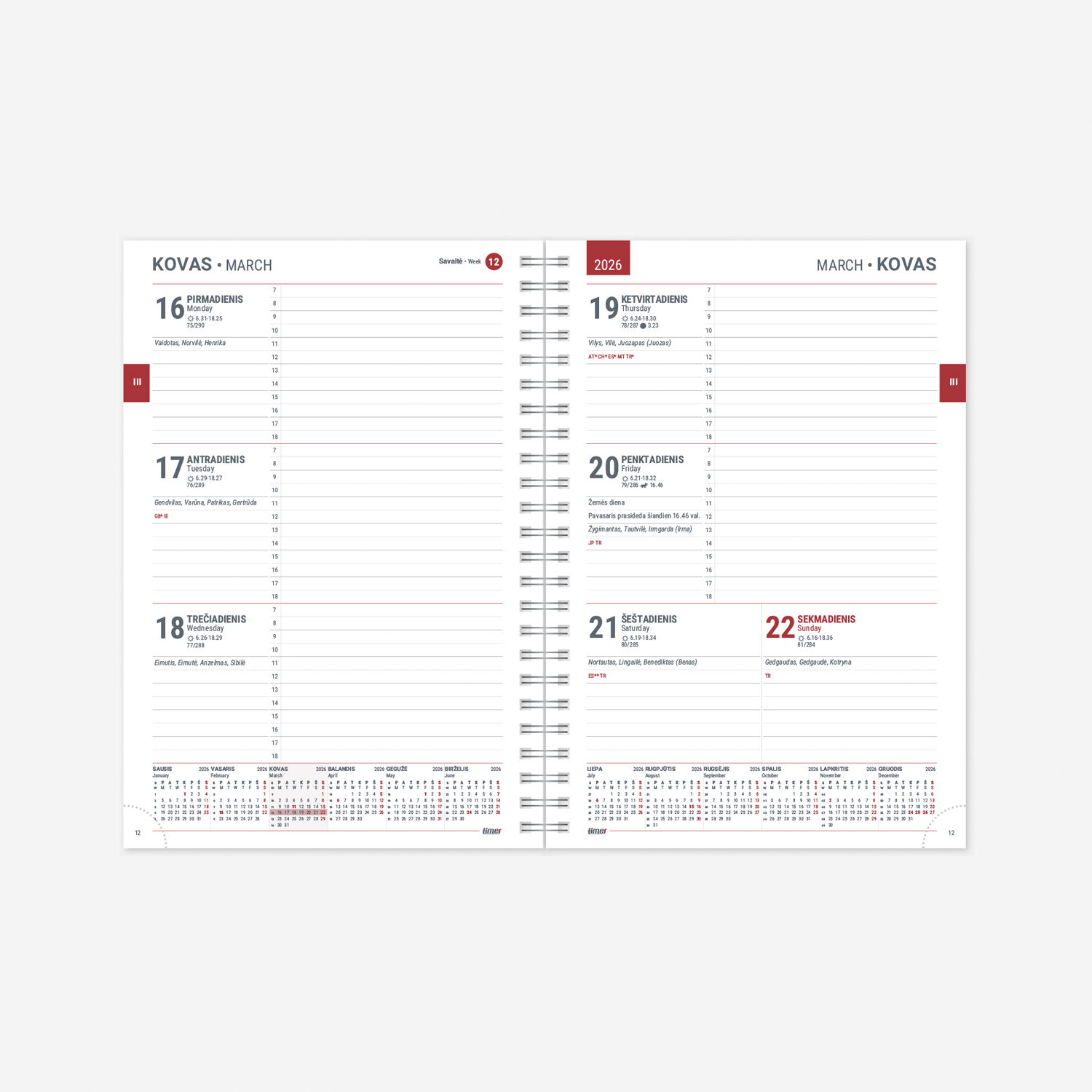 | Kalendoriaus tipas | Savaitės planavimas |
