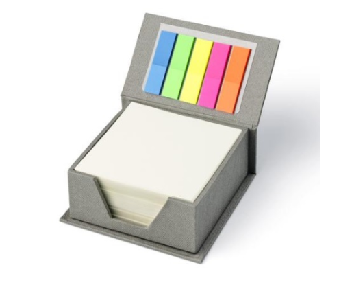 Užrašų lapelių ir indeksų rinkinys BC17676. Rinkinį sudaro: kartoninė dėžutė, 300 vnt lapelių užrašams, lipnūs indeksai. Išmatavimai 107x99x48 mm. Tinka dėti reklaminį užrašą.