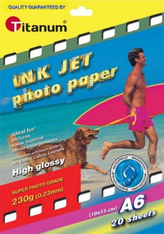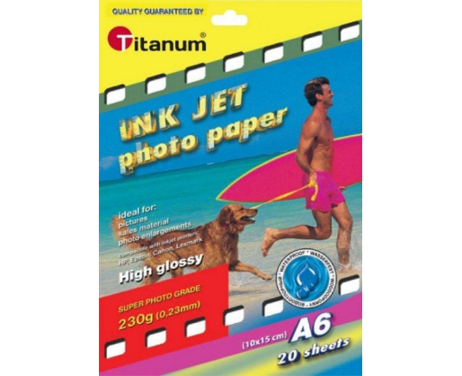 Foto popierius TITANUM A6 (10x15cm), 230g, 20 lapų, blizgus, rašaliniams spausdintuvams, atsparus vand.