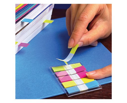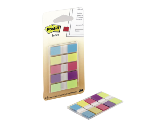 POST-IT INDEX maži žymekliai Labai naudingi klasifikavimui ir organizavimui. Spalvotos juostelės leidžia taikyti spalvinį kodavimą. Tinka įklijuoti į užrašų knygelę, darbo dienynus. Ant jų galima rašyti bet kokiu rašikliu. 5 neoninių spalvų po 20 vnt. kiekvienos spalvos. Matmenys 11.9 x 43.2 mm. Pakuotėje 100 vienetų.Prekės parametrai