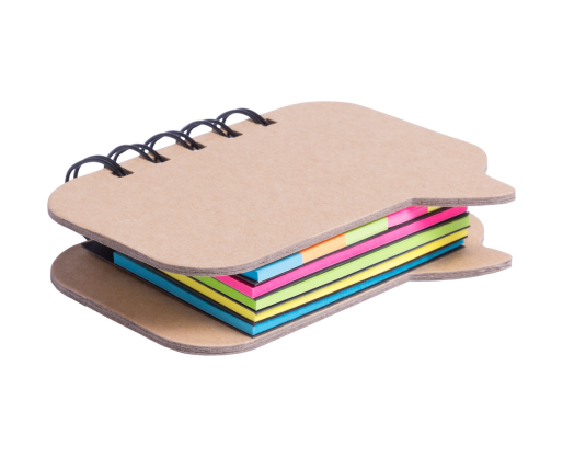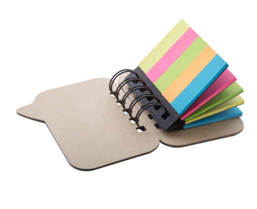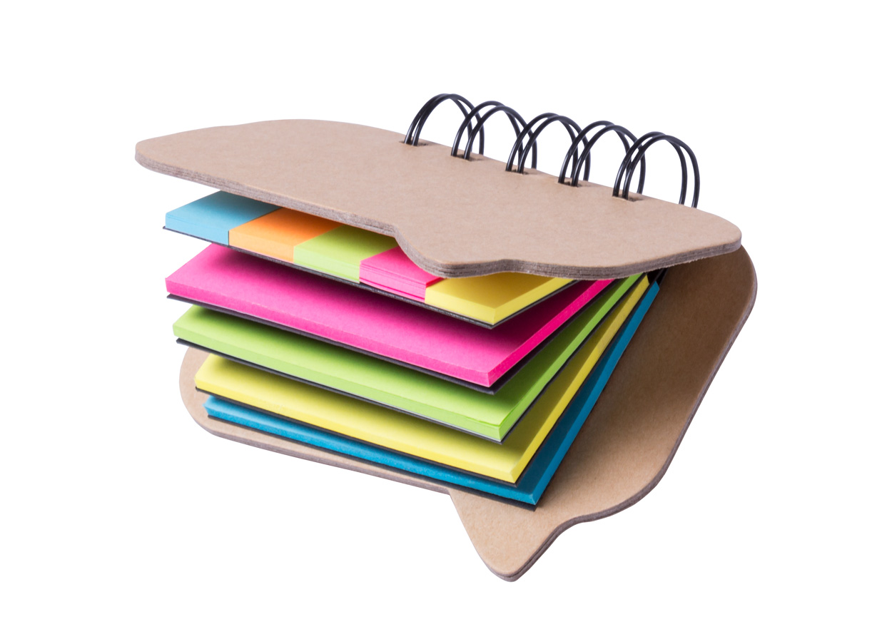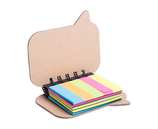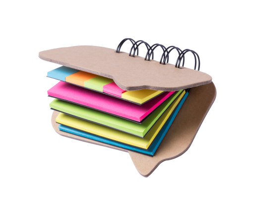 Perdirbto popieriaus lipnių lapelių ir žymeklių rinkinys. Knygelė dialogo burbulo formos.