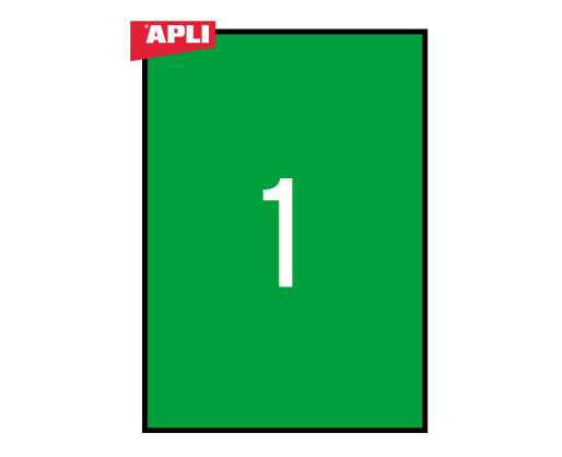 Etiketiniai lipdukai APLI. Žalios spalvos. Matmenys 210x297 mm. A4 formatas. 20 lapų pakuotėje.