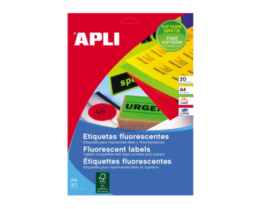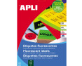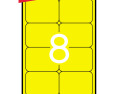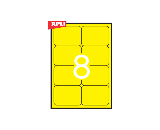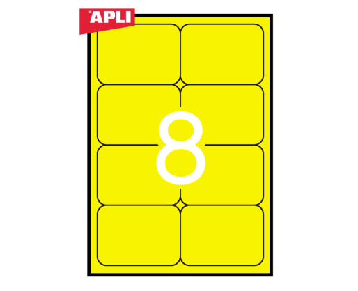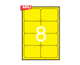 Etiketiniai lipdukai APLI. Fluoresencinės geltonos spalvos. Suapvalintos. Matmenys 99,1x67,7 mm. A4 formatas. Lape 8 lipdukai. 20 lapų pakuotėje.