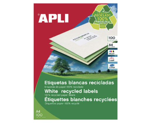Etiketiniai lipdukai APLI. Iš perdirbto popieriaus. Tinka kopijavimo aparatams, rašaliniams, spalvotiems ir nespalvotiems lazeriniams spausdintuvams. Matmenys 105 x 148 mm. A4 formatas. Pakuotėje 100 lapų.Prekės parametrai