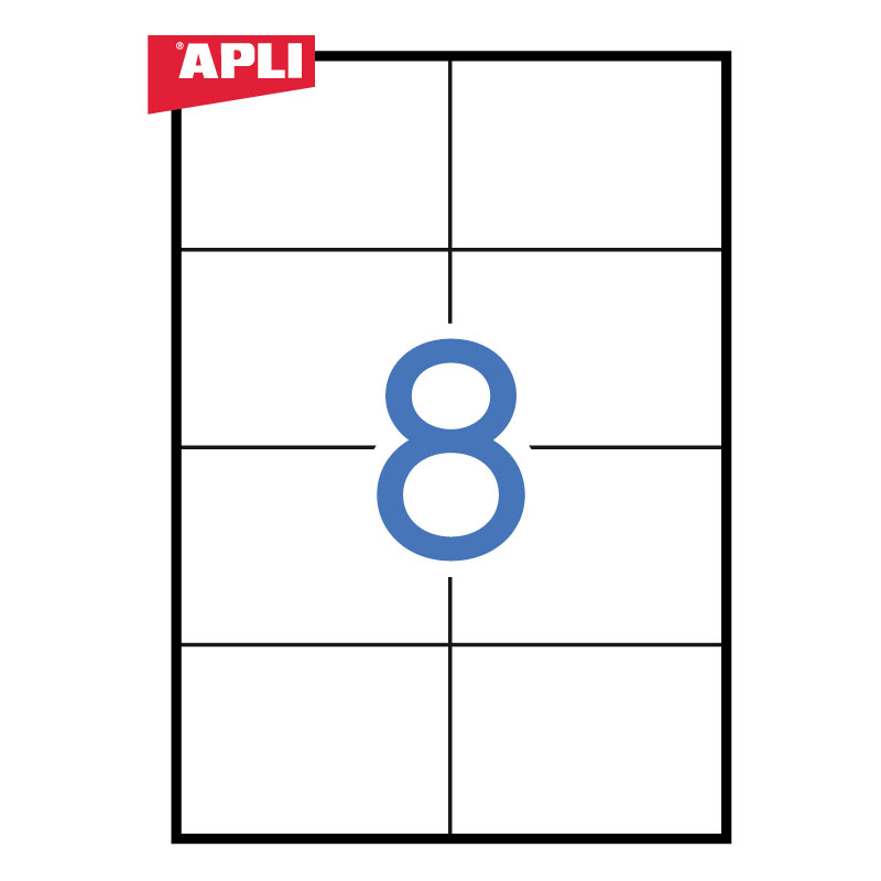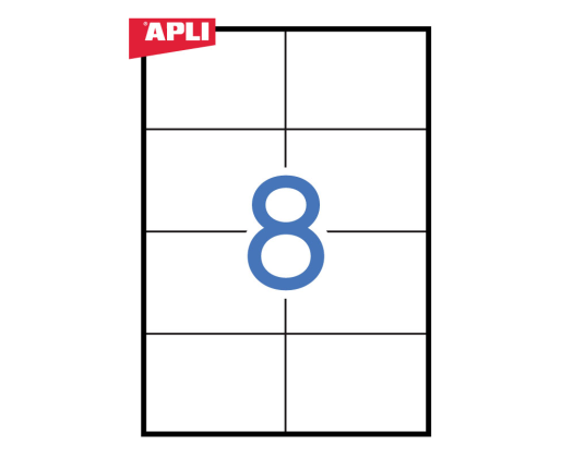 Etiketiniai lipdukai APLI Tinka rašaliniams ir lazeriniams spausdintuvams, kopijavimo aparatams. Matmenys 105 x74 mm. Lape 8 lipdukai. Dėžutėje 100 lapų. Paprastas ir efektyvus etikečių spausdinimas su APLI Soft Pro SE- atsisiųskite nemokamai iš www.apli.com