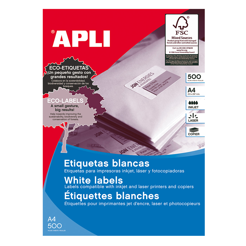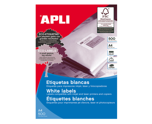 Etiketiniai lipdukai APLI, 105 x 74 mm, A4, 8 lipdukai lape, 500 lapų, balta sp. Tinka visų tipų spausdintuvams bei kopijavimo aparatams.Prekės parametrai