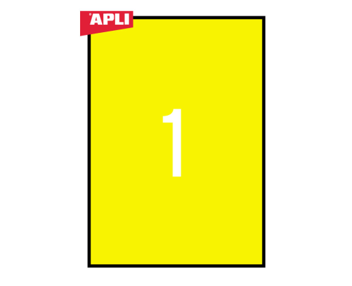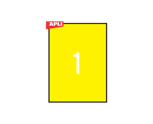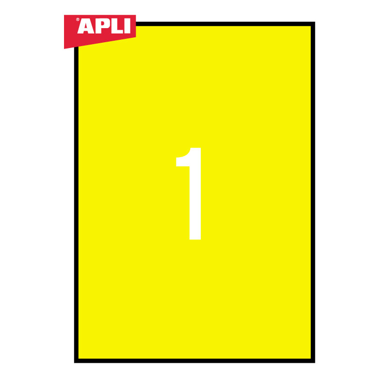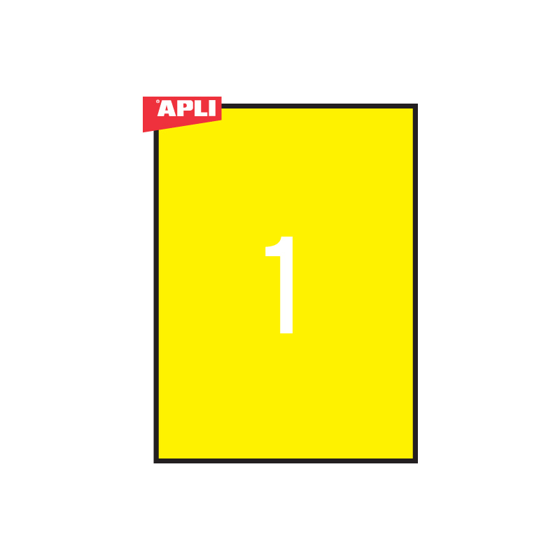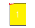 Etiketiniai lipdukai APLI. Geltonos spalvos. Matmenys 210x297 mm. A4 formatas. Lape 1 lipdukas. 20 lapų pakuotėje.