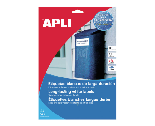 Etiketiniai lipdukai APLI Atsparios aplinkos poveikiui etiketės. Tinka kopijavimo aparatams, lazeriniams spausdintuvams. Etiketės pagamintos iš polisterio plėvelės. Sunkiai plyšta. Matmenys 210 x 297 mm. Matinės, permatomos. Lape 1 lipdukas. Pakuotėje 20 lapų.