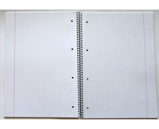 Sąsiuvinis A4 formato, langeliais, kartoniniu viršeliu. Su spiralės tvirtinimu šone, perforacija lapams plėšti kairiame šone, 4 skylučių.