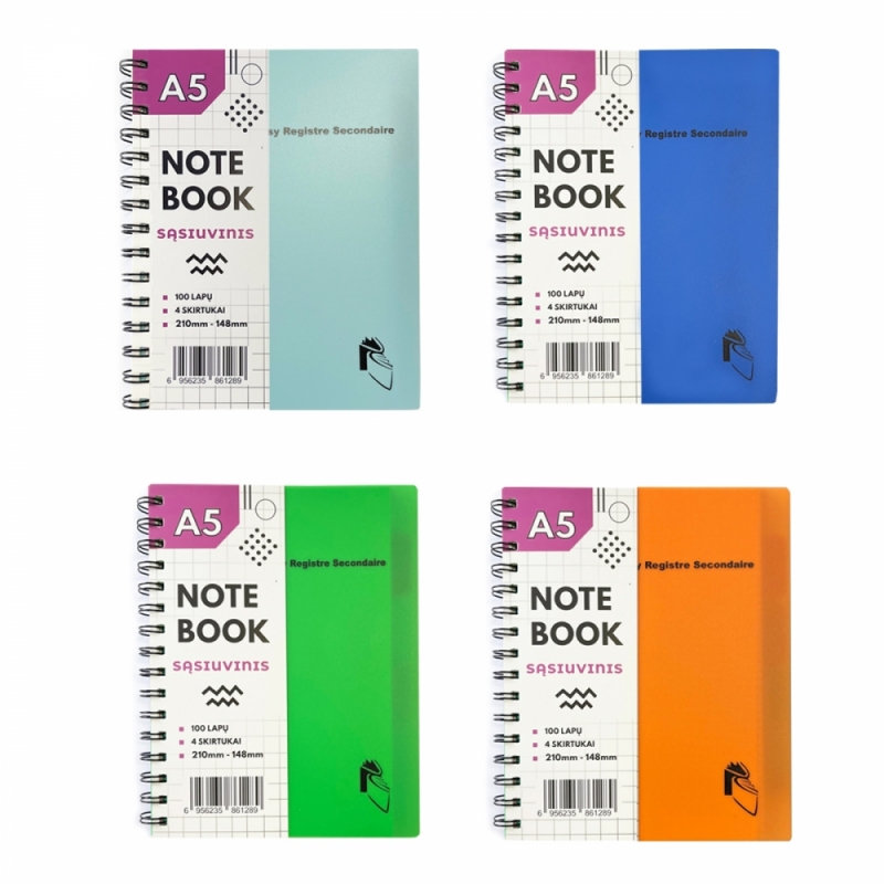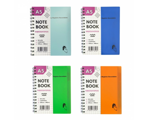 - Sąsiuvinis A5/100l. su spirale, langeliais plast.virš., 5 plast.sp.skirtuk.,5 skyrių