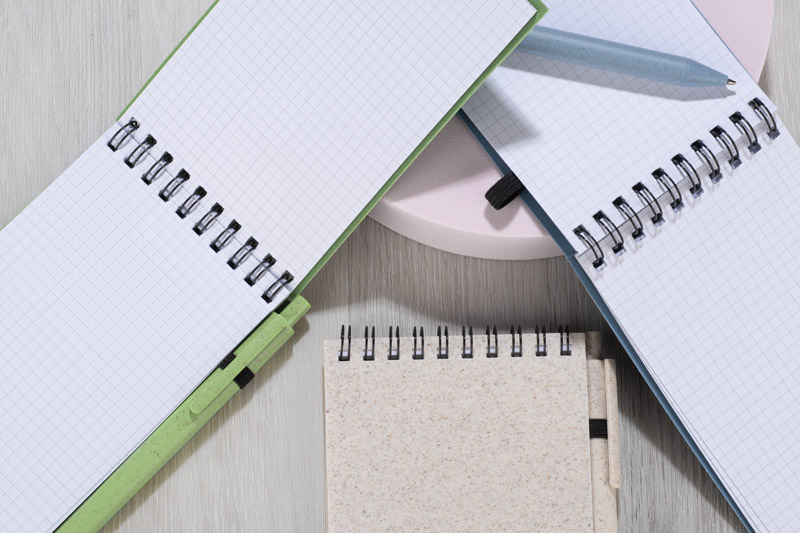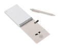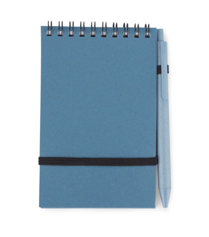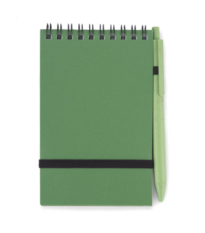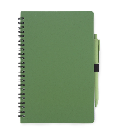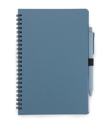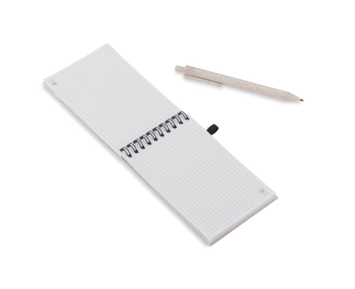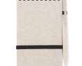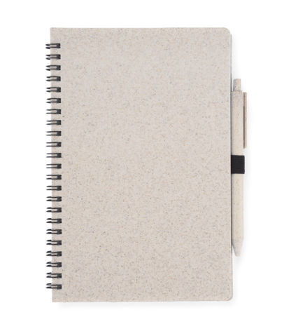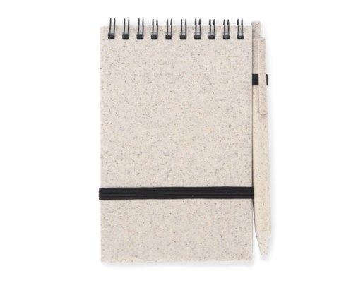Knygos viršelis ir tušinuko korpusas pagaminti iš kviečių šiaudų plastiko. Užrašų knyga su spirale, A6 formato, 70 lapų linija.