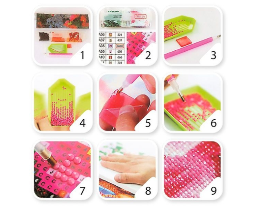 1. Atidarę įpakavimą patikrinkite ar rinkinyje yra specialus įrankis, mažas padėkliukas, deimanteliai maišeliuose, vaško kvadratėlis ir papildomas maišelis.