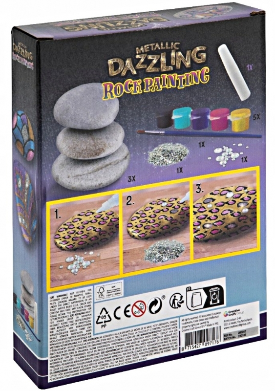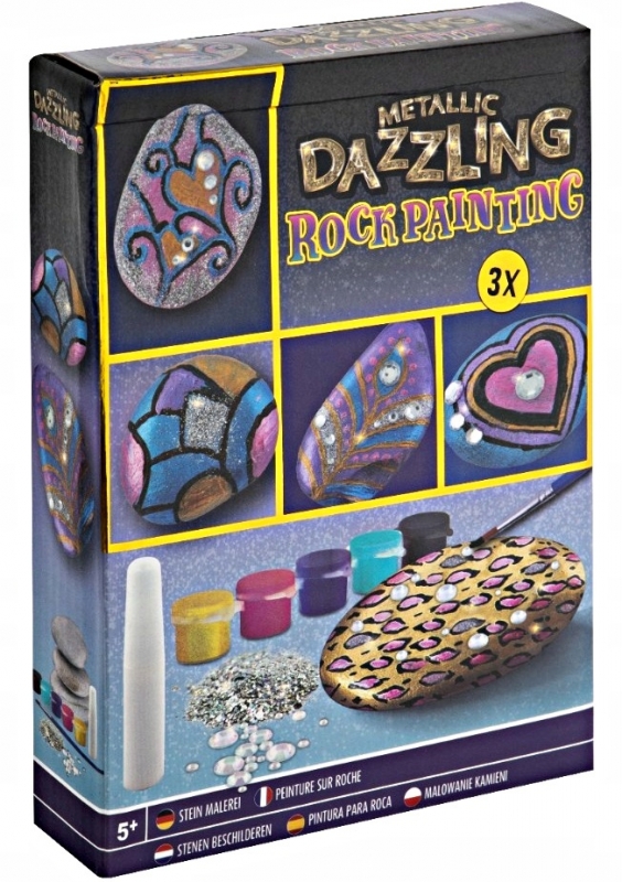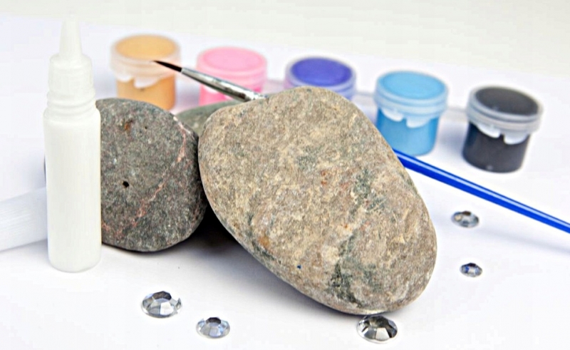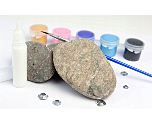 Rinkinį sudaro 3 akmenys, teptukas, 5 akrilininiai dažai, klijai.