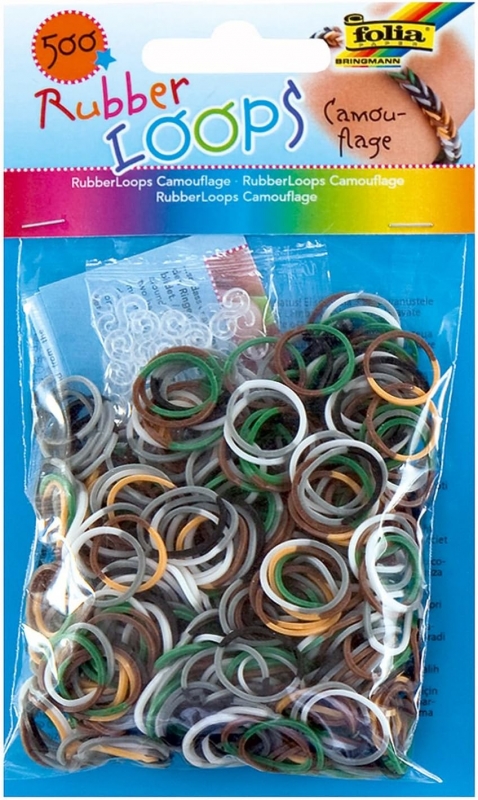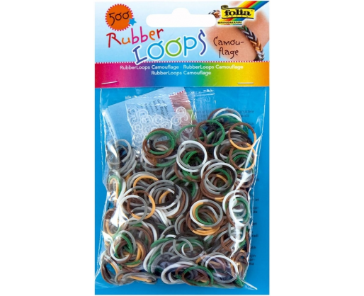 Rubber loops gumytės pynimui, kamufliažinės, Mix, 500vnt. + 25 užsegimai ir nėrimo kabliukas Folija
