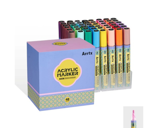 Aukštos kokybės nenuplaunami akriliniai markeriai-flomasteriai ARRTX yra skirti piešti ant įvairių paviršių, tokių kaip popierius, kartonas, drobė, įvairios sudėties audinys, stiklas, keramika, plastikas, medis, akmuo ar kitų. Komplektą sudaro 48 spalvų flomasteriai. Flomasteriai saugūs, bekvapiai, berūgščiai, pagaminti vandens pagrindu. Tinkami šventinėms dekoracijoms. Šis rinkinys yra puiki dovana visiems, kas mėgsta taikomosios dailės darbelius. Rekomenduojama pradedantiesiems.Ypatybės:
