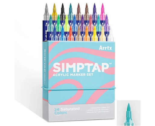 Aukštos kokybės ryškių spalvų akriliniai markeriai-flomasteriai ARRTX Simptap su spaustuku yra skirti piešti ant įvairių paviršių, tokių kaip kartonas, audinys, gipsas, metalas, stiklas, keramika, plastikas, medis, akmuo ir pan. Pasižymi ryškiomis ir gyvomis spalvomis, puikiu padengimu, atsparumu vandeniui. Komplektą sudaro 24 flomasteriai: 22 spalvoti, 1 juodos ir 1 baltos spalvos. Flomasteriai saugūs, bekvapiai, berūgščiai, pagaminti vandens pagrindu. Tinkami šventinėms dekoracijoms. Šis rinkinys yra puiki dovana visiems, kas mėgsta taikomosios dailės darbelius.Ypatybės: