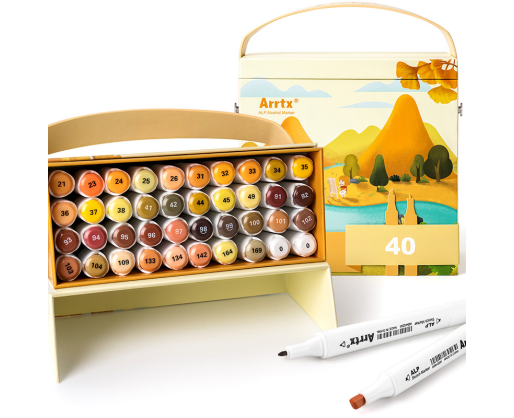 Itin ryškūs ir kokybiški profesionalūs markeriai-flomasteriai ARRTX Alp, skirti piešimui, iliustravimui, eskizavimui, ryškinimui, atvaizdavimui. Komplekte yra 40 geltono tono atspalvių. Šis markerių-flomasterių rinkinys pateikiamas su stilingo dizaino dėžute. Dėžutė sukurta taip, kad kiekvienas markeris-flomasteris turėtų atskirą skyrių, o atidarius dėžutę jos dangtis galėtų būti naudojamas kaip stovas. Dėžutės viršuje įmontuotas dirželis leidžia lengvai ne nešiotis flomasterius-markerius į jums patogią vietą. Tuščia dėžutė gali būti naudojama kaip daiktadėžė.Ypatybės: