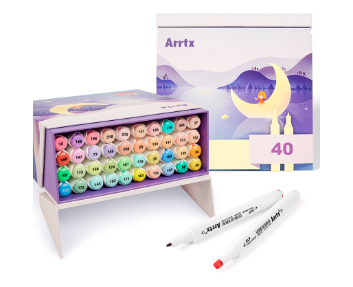 Itin ryškūs ir kokybiški profesionalūs markeriai-flomasteriai ARRTX Alp, skirti piešimui, iliustravimui, eskizavimui, ryškinimui, atvaizdavimui. Komplekte yra 40 pastelinių atspalvių. Šis markerių-flomasterių rinkinys pateikiamas su stilingo dizaino dėžute. Dėžutė sukurta taip, kad kiekvienas markeris-flomasteris turėtų atskirą skyrių, o atidarius dėžutę jos dangtis galėtų būti naudojamas kaip stovas. Tuščia dėžutė gali būti naudojama kaip daiktadėžė.Ypatybės: