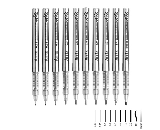 Aukštos kokybės ARRTX grafiniai rašikliai pasižymi įvairaus plonumo galiukais ir leidžia nubrėžti skirtingų storių linijas. Komplektą sudaro 10 juodos spalvos gelinių rašiklių skirtingomis galvutėmis nuo 0.03mm iki 2mm storio. Jie puikiai tinka grafikos darbams, dailyraščiui, iliustracijoms, braižybai, dizaino, eskizavimo ir mišrioms technikoms atlikti. Rašikliai greitai džiūsta, nepalieka dėmių, neblunka, lieka atsparūs vandeniui. Tinka profesionaliems menininkams ir mėgėjams.Ypatybės: