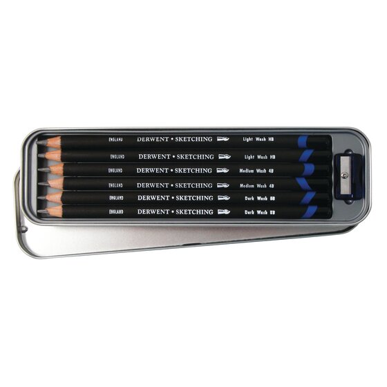 Kompaktiška metalinė dėžutė su šešiais eskizų pieštukais ir aukščiausios kokybės pieštukų drožtuku.