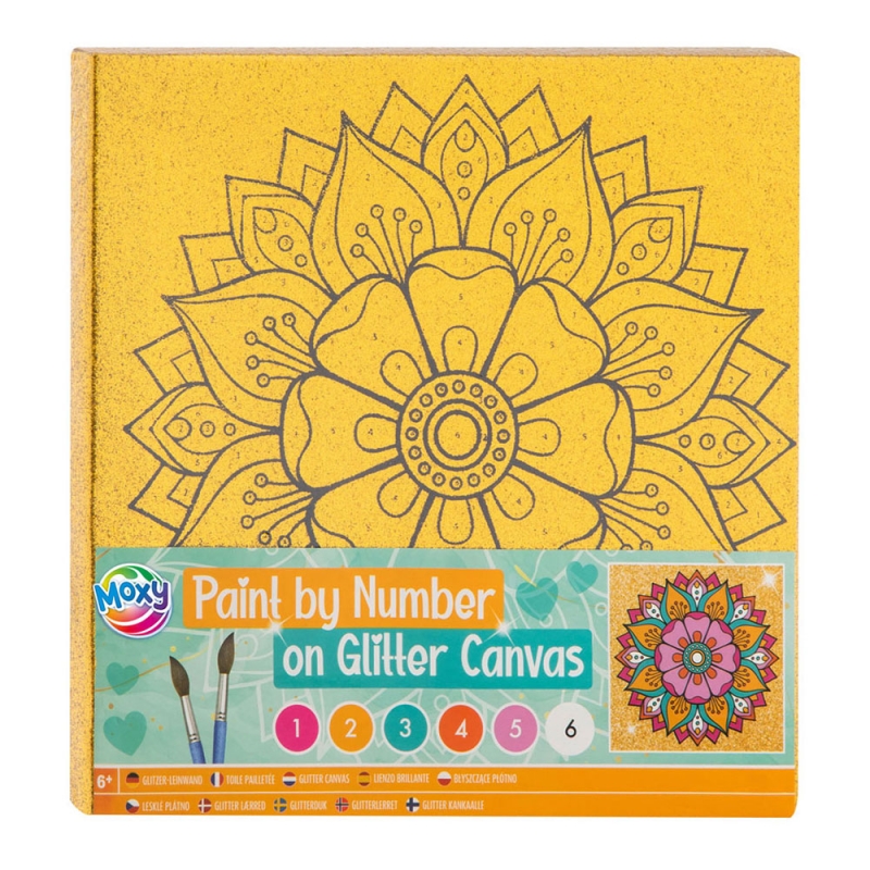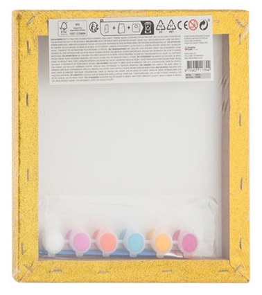 Rinkinyje yra 6 dažų spalvos ir 2 teptukai. Drobės matmenys: 25 x 25 cm. Tinka vaikams nuo 6 metų.