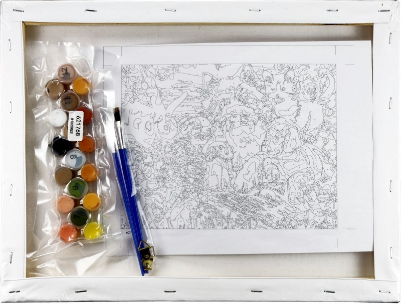 1. Padėkite visas medžiagas priešais save; dažų indelių skaičiai atitinka skaičius ant drobės