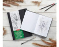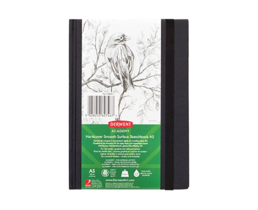 Derwent Academy eskizų albumas – eskizų sąsiuvinis kietu viršeliu, užsegamas elastine gumyte. A5 dydis (14,8 × 21 cm), 128 lapai, popieriaus storis 135 g/m².