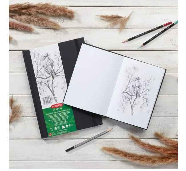 Derwent Academy serijos eskizų sąsiuvinis. Jame yra 128 lapai balto, lygaus 135 g/m² popieriaus. Blokas skirtas sausoms technikoms, tokioms kaip pieštukas, anglis, sepija, sangvina bei visų tipų spalvoti pieštukai. Popieriaus storis taip pat leidžia dirbti su tušu ir lineriais. Popierius yra be rūgščių, ypač baltas ir turi mikroperforaciją, kad lapus būtų lengva išplėšti. Eskizų sąsiuvinis su kietu, juodu lininės tekstūros viršeliu, užsegamas elastine juostele. Įrištas per ilgesniąją kraštinę.