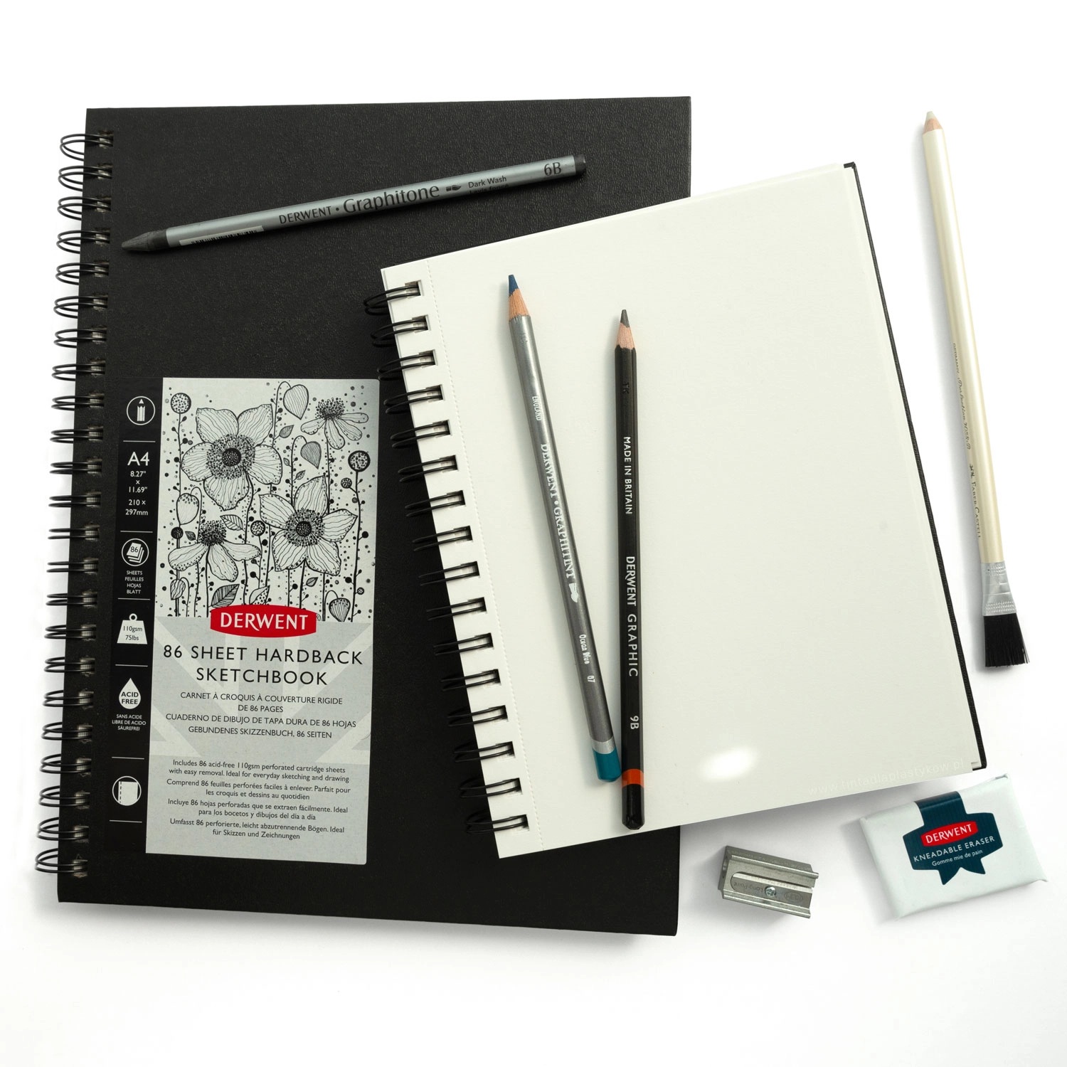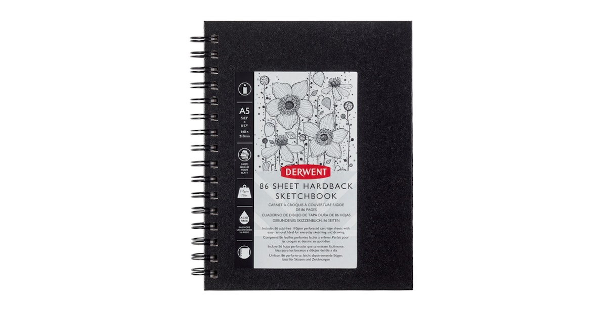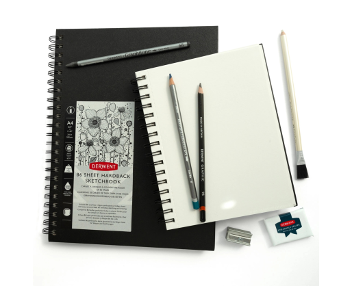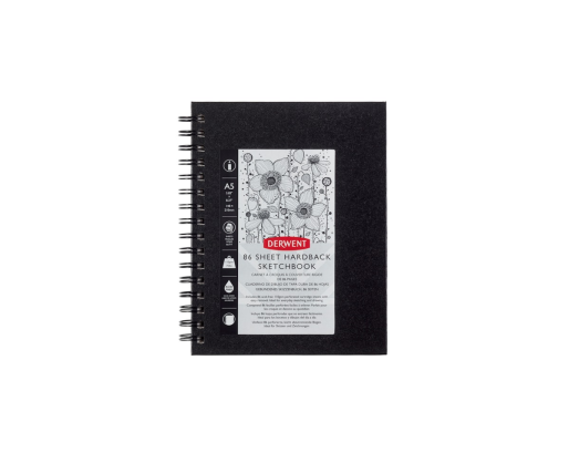 Derwent eskizų sąsiuvinis su tvirtu kietu viršeliu ir plačia spirale. Puikiai tinka piešti grafitiniais ir angliniais pieštukais, spalvotais pieštukais bei kitomis sausomis piešimo priemonėmis. Sąsiuvinyje yra 86 lapai švelnios faktūros, 110 g/m² popieriaus.