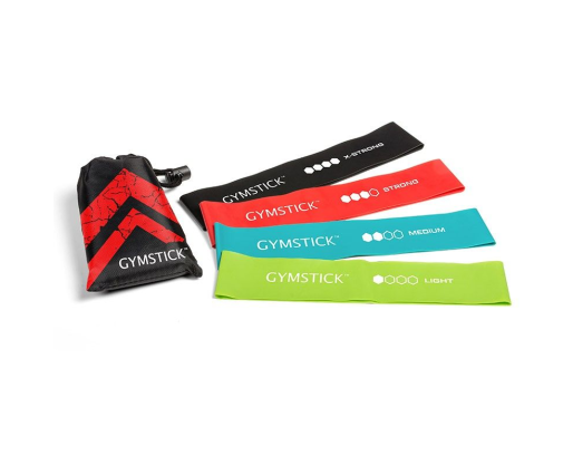 Gymstick Mini Bands yra kompaktiškos lateksinės juostos maknkštai, kurios idealiai tinka apšilimui prieš sportą ar kūno mankštai. Rinkinį sudaro 4 skirtingo stiprumo juostos (Light, Medium, Strong, X-Strong) ir laikymo krepšys. Savybės: Medžiaga: lateksas ir nailonas. Ilgis: 25 cm. Plotis: 5 cm. Didžiausias tempiamas svoris: Light - 4,5kg; Medium - 9kg; Strong - 14kg; X-Stong - 18kg.Prekės parametrai