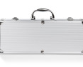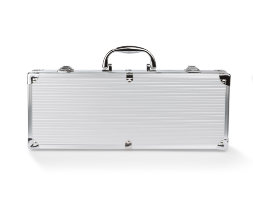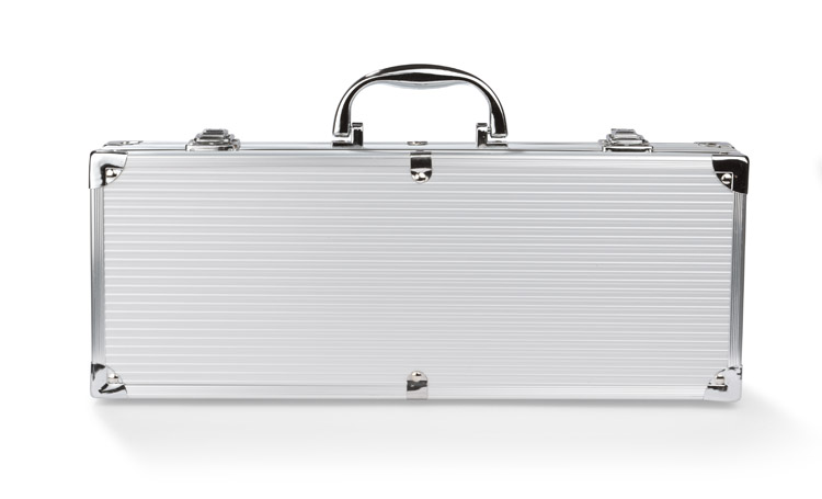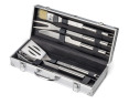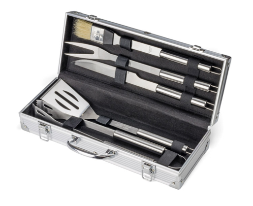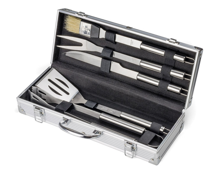 Kepsninės komplektas dežutėje: žnyplės, mentelė, peilis, šakutė ir šepetėlis.
