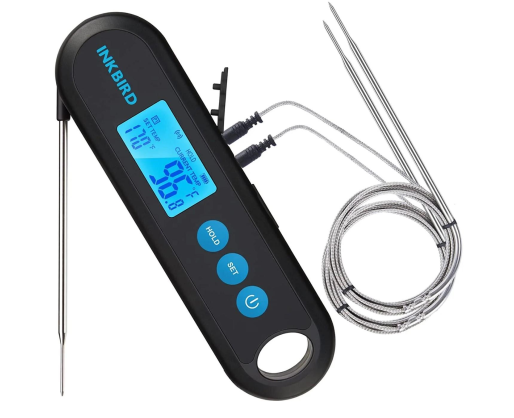 Ypatingai patogus, kompaktiškas ir kiekvienam grilintojui reikalingas – dviejų funkcijų Inkbird IHT-2PB termometras. Nuo šiol turėdami vieną įrenginį, galėsite naudoti jį ir kaip momentinį greitojo nuskaitymo termometrą, ir kaip zondinį, nuotolinį Bluetooth BBQ termometrą. Termometras turi du zondus, kuriuos galite naudoti, gamindami patiekalus netiesioginėje kaitroje, ilgai ir lėtai, karštai rūkydami ir pan. Termometras susijungs su Jūsų telefonu Bluetooth ir specialioje programėlėje matysite visą reikiamą Jūsų patiekalo temperatūros informaciją. Norėdami termometrą naudoti, kaip greitojo nuskaitymo, papildomus zondus atjunkite ir naudokitės atlenkiamu davikliu. Termometras pakraunamas. Didelis, aukštos kokybės LCD ekranas, užtikrina raiškų skaičių matomumą tiek šviečiant saulei, tiek tamsoje. Termometras veikia su Inkbird programėle.
