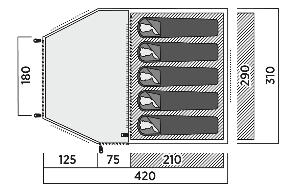 | Flysheet | WeatherGuard 3000, 190T polyester PU coated, PFC free water repellency, fire retardant |