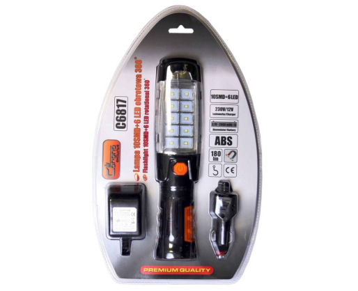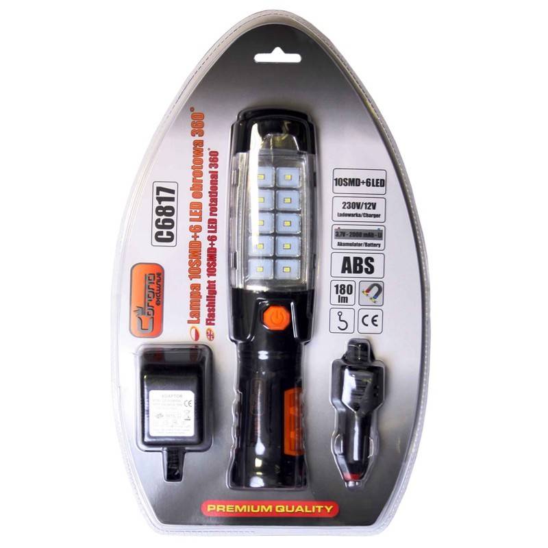 Žibintuvėlis su galimybe apsukti 360 laipsnių. Turi kabliuką pakabinimui, magnetą, įkraunamas, baterija 2000 mAh, 10 + 6 LED, SMD LED, 168 lm.