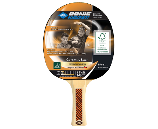 Stalo teniso raketė Donic Champs 300, skirta pradedantiesiems žaidėjams. Mediena: Basic FSC (5B) Rankena: įgaubta Gumos storis: 1 mm Paskirtis: vidaus Žaidimo stilius: kontrolė ITTF patvirtinta: Ne Rankenos tipas: platėjanti gale Greitis: 30 Sukimas: 40 Kontrolė: 90Prekės parametrai