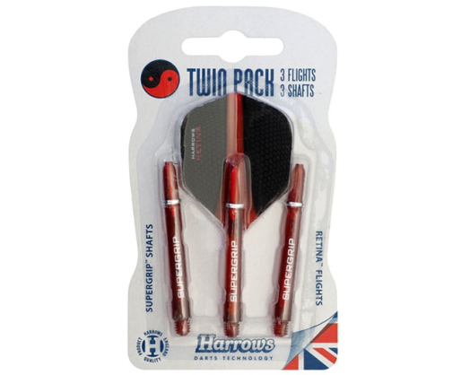 Strėlyčių sparnelių ir kotelių rinkinį HARROWS TWIN PACK sudaro 3 RETINA sparneliai ir 3 SUPERGRIP koteliai. SUPERGRIP - tvirto nailono preciziškai pagaminti koteliai, kurie pagaminti su žiedais, kurie stipriau fiksuoja sparnelius. Standart formos RETINA sparneliai 100 mikronų storio. Šiuos sparnelius sudaro unikalus sluoksnių lydinys: ypač patvarus ir ilgaamžis laminatas išorėje ir aukštos raiškos permatomas sparnelių centras, kuris suteikia metimui tikslumo.Prekės parametrai