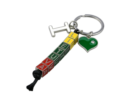 Metalinis raktų pakabukas susideda iš raidės I, širdelės ir užrašo Lietuva susidedančio iš septynių raidžių.