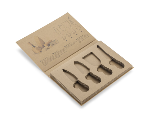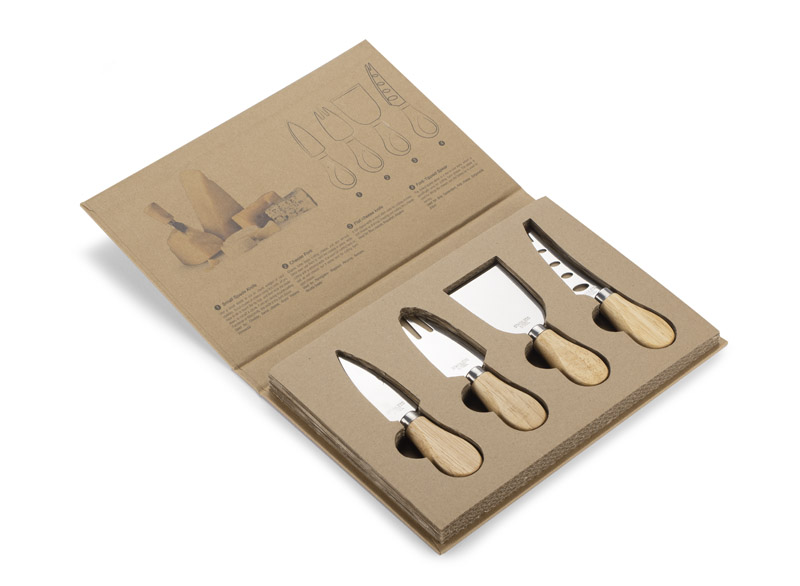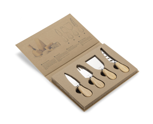 4 sūrio peilių rinkinys popierinėje dėžutėje. Pakuotės viduje yra kiekvieno peilio nuotrauka su aprašymu.