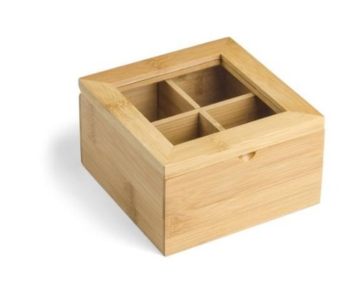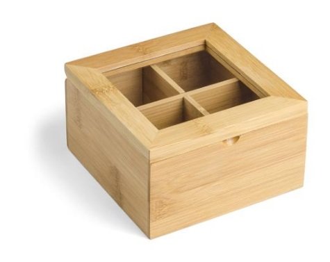 Dėžutė arbatai. Keturi skyreliai. Išmatavimai 141x139x81 mm. Pagaminta iš bambuko ir plastiko. Puikiai tiks namuose ar biure laikyti skirtingų rūšių arbatas. Galima dėti užrašą reklamai.