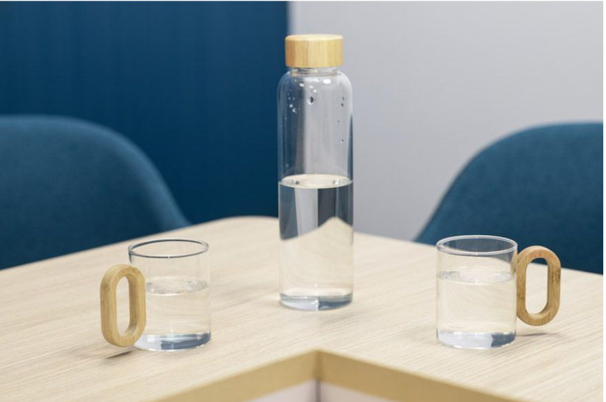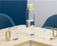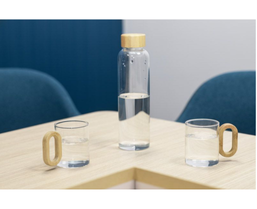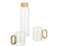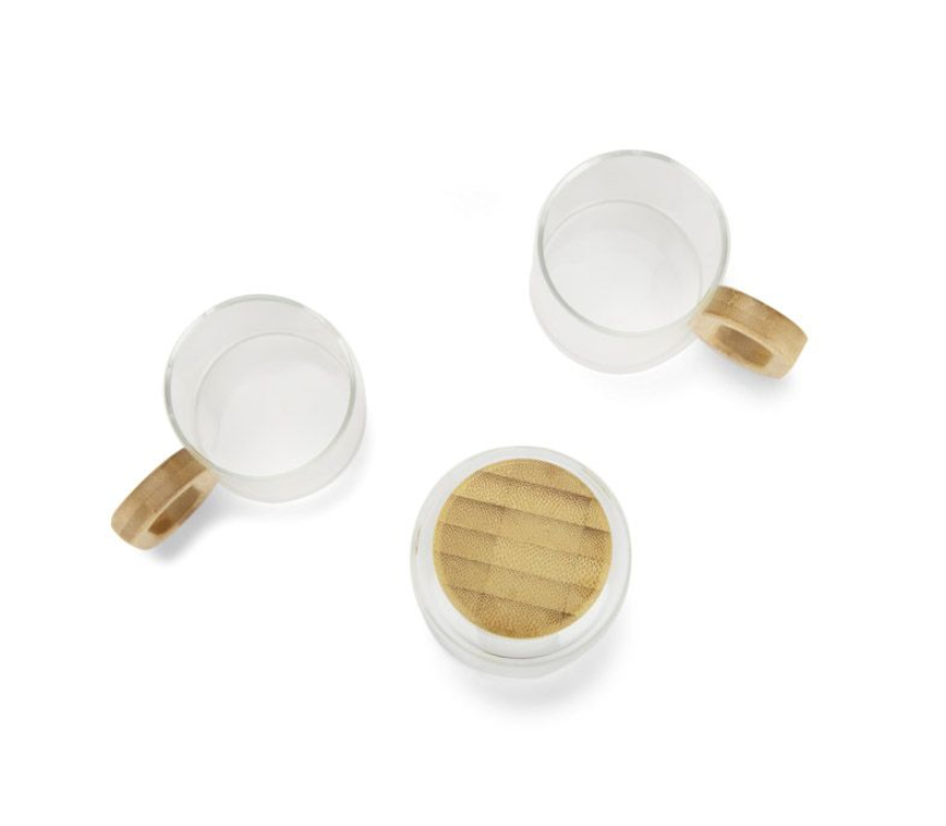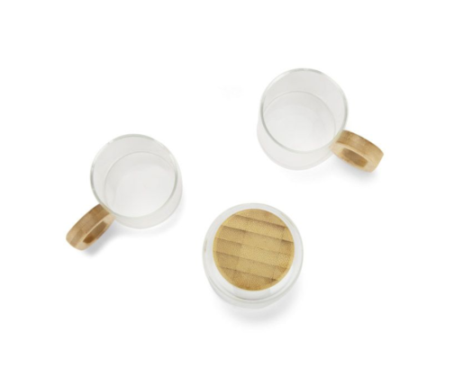 Gertuvė su bambukiniu dangteliu, o puodeliai su bambukinėmis rankenėlėmis.