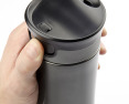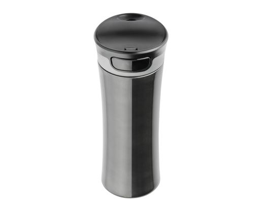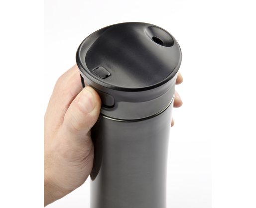 Šis puodukas su nepralaidžiu dangteliu gali būti naudojamas ir kaip vakuuminė kolba. Išlaiko temperatūrą iki 10 val. Patogus naudoti – norėdami atrakinti dangtį tiesiog paspauskite dangtelio mygtuką. Dangtis bus uždarytas automatiškai, kai atleisite mygtuką.