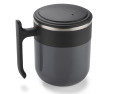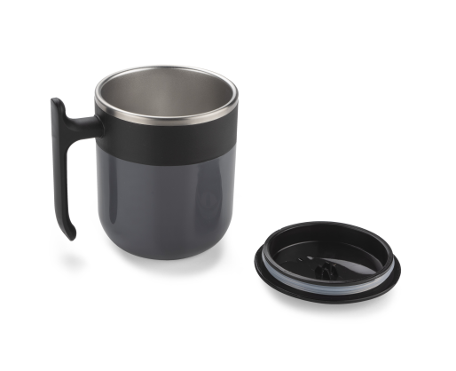Puodelio išorinis sluoksnis pagamintas iš plastiko, o puodelio vidus iš nerūdyjančio plieno.