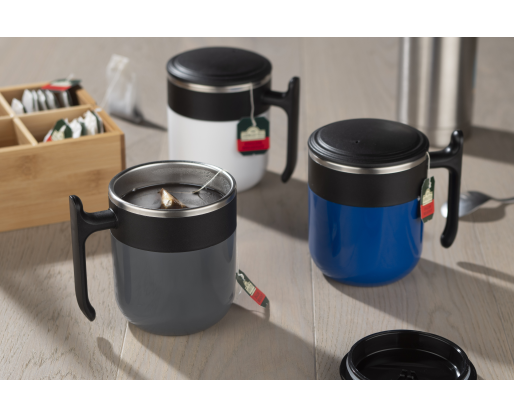 Puodelio dangtelis yra su ventiliacija, neleidžia gėrimui išsilieti ir padeda palaikyti temperatūrą.