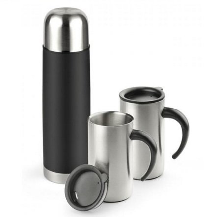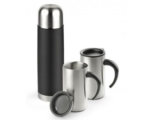 Termosas 500ml ir du termosiniai puodeliai 260ml. Pagaminta iš plastiko ir metalo. Išmatavimai termoso 245x69 mm, puodelio 117x65 mm. Termosas išlaiko šilumą iki 12 val, puodelis iki 3 val. Galima dėti reklaminį užrašą.