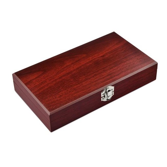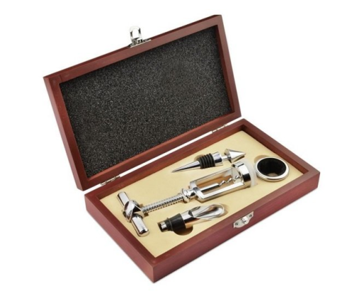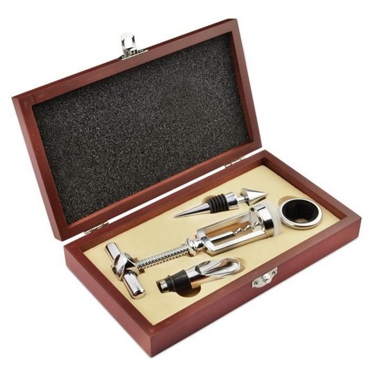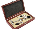 Vyno įrankių rinkinys medinėje dėžutėje BC17569. Rinkinį sudaro atidarytuvas, butelio kamštis, butelio žiedas, piltuvėlis. Pagaminta iš metalo ir medienos. Išmatavimai 45x230x130 mm.