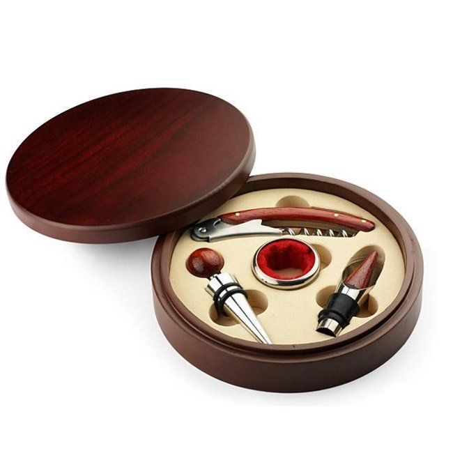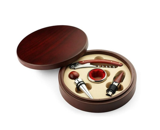 Vyno įrankių rinkinys medinėje dėžutėje BC17541. Rinkinį sudaro atidarytuvas/peilis, butelio kamštis, butelio žiedas, piltuvėlis. Pagaminta iš metalo ir medienos. Išmatavimai 37x158mm.
