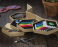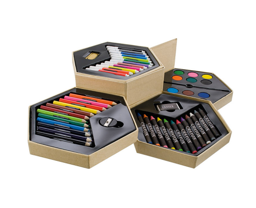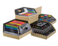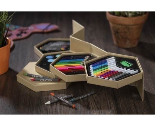 Platus piešimo rinkinys, kurį sudaro mediniai pieštukai, flomasteriai, akvareliniai dažai ir vaškinės kreidelės. Viskas supakuota į ekologišką kartono dėžutę.
