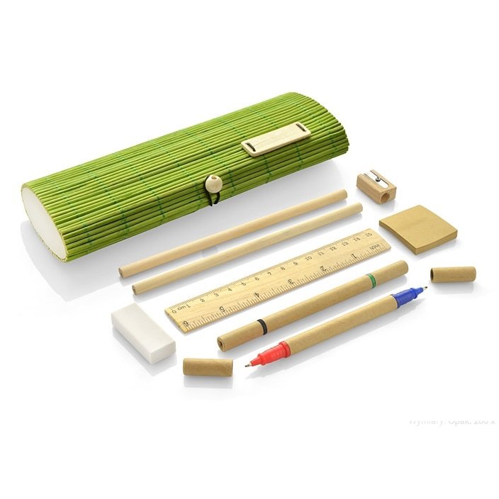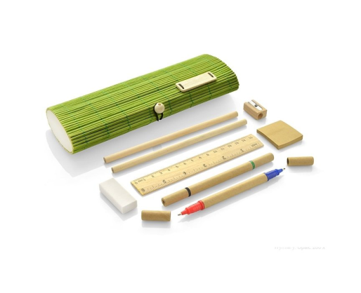 Rinkinys BAMBOO BC17620-13, šviesiai žalios spalvos pagamintas iš perdirbtų medžiagų. Rinkinys sudaro: du dvipusiai tušinukai (mėlynas, raudonas, juodas, žalias), du pieštukai, trintukas, drožtukas, liniuotė, lapeliai ir dėžutė. Tinka graviravimui.