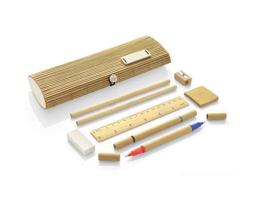 Rinkinys BAMBOO BC17620-17, smėlio spalvos pagamintas iš perdirbtų medžiagų. Rinkinys sudaro: du dvipusiai tušinukai (mėlynas, raudonas, juodas, žalias), du pieštukai, trintukas, drožtukas, liniuotė, lapeliai ir dėžutė. Tinka graviravimui.